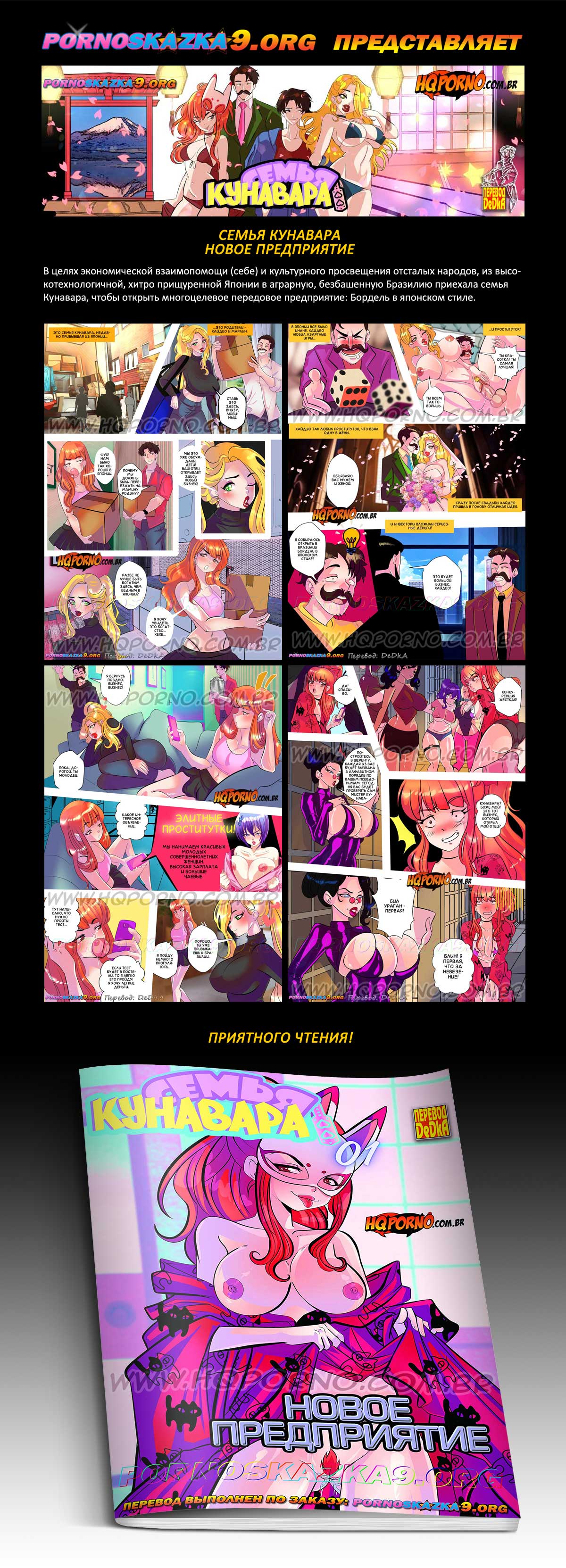 Порно комикс «Семья Кунавара. Часть 1. Новое предприятие.» В целях экономической взаимопомощи (себе) и культурного просвещения отсталых народов, из высокотехнологичной, хитро прищуренной Японии в аграрную, безбашенную Бразилию приехала семья Кунавара, чтобы открыть многоцелевое передовое предприятие: Бордель в японском стиле.