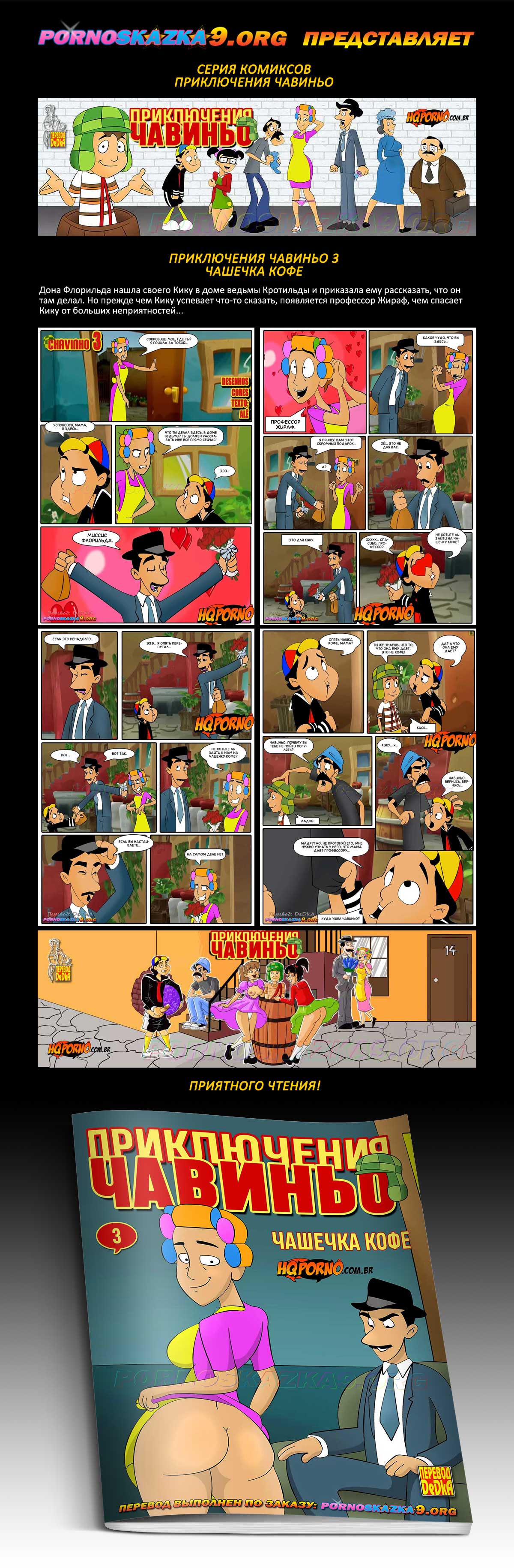 Порно комикс «Приключения Чавиньо. Часть 3. Чашечка кофе.» Дона Флорильда нашла своего Кику в доме ведьмы Кротильды и приказала ему рассказать, что он там делал. Но прежде чем Кику успевает что-то сказать, появляется профессор Жираф, чем спасает Кику от больших неприятностей…